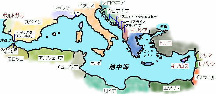 「地中海」各国のひとこと紹介を、表にまとめました。大きな国になると内陸部は全く違った特徴が出てきますので、ここでは地中海沿岸に限定して述べました。 |